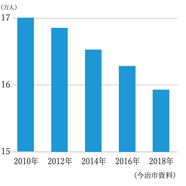 上のグラフは、2010年から2018年の今治市の人口とごみの量の変化を表しています。